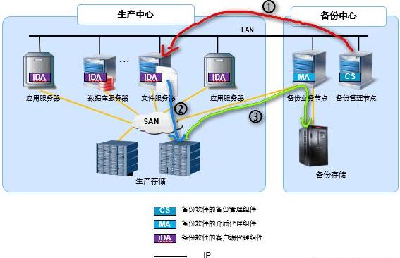 备份管理系统:包含备份软件及备份管理服务器,执行相应的备份任务的监管,将来自备份客户端的数据写入备份介质;