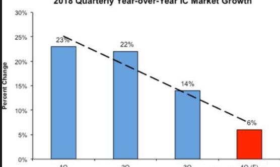 今年第三季显著的下降趋势似乎证实了年增率放缓的态势。2017 年,第三季对第二季IC 市场年增率幅度为11%,相比之下,今年第三季对第二季年增率幅度放缓至6%,IC 产业在今年第三季明显降温。