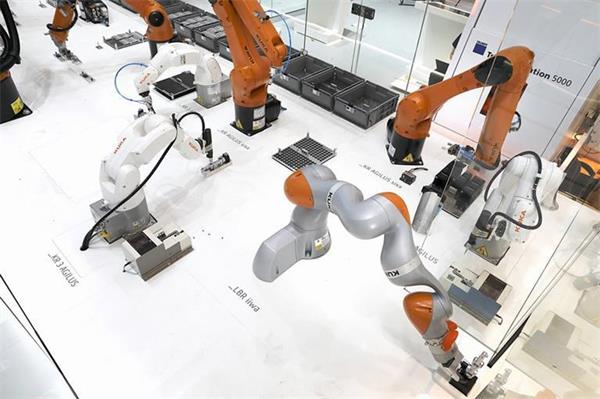 机器人领导品牌KUKA在本届进博会中,利用500平的大展台,就地搭建出一个小型的智能工厂。在这个展示工厂里面,众多机械手臂在工作台上,有条不紊地作业,充分展示了其高效、灵活、稳定和精密。除了工厂之外,这套智能自动化系统还能为医疗行业、快消行业等领域的从业者提供个性化服务方案。