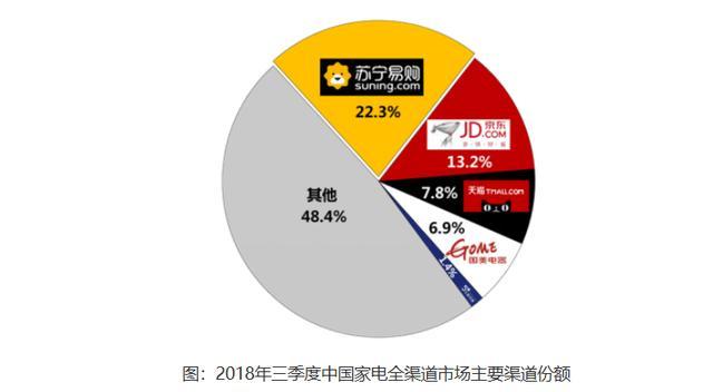 近日,中国家用电器研究院和全国家用电器工业信息中心联合发布的《2018年中国家电行业三季度报告》显示,2018年第三季度,中国家电市场全渠道销售规模达1821亿元。其中,苏宁占比22.3%,增速远超行业,领跑全渠道第一;京东份额为13.2%;天猫和国美分别为7.8%和6.9%。从数据中可以看出,苏宁易购在家电销售行业中的占比已经远超同行业。