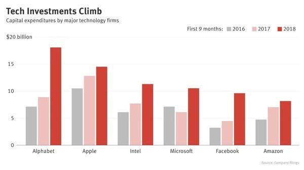 今年各科技巨头的资本开支出现了巨大的增长,数据中心以及运营数据中心的计算机和海底电缆在其中占了大头。这其中Facebook和谷歌母公司Alphabet的开支增幅明显高于业内其它公司,今年前九个月的投资相较去年同期增长了一倍。微软和英特尔在此期间也明显增加了它们的开支。这一井喷式的开支增长正是科技公司们对未来业务发展持乐观态度的体现,它们乐于将从主要业务中赚取的利润和通过减税政策节省的开支投入到基础设施的建设中。