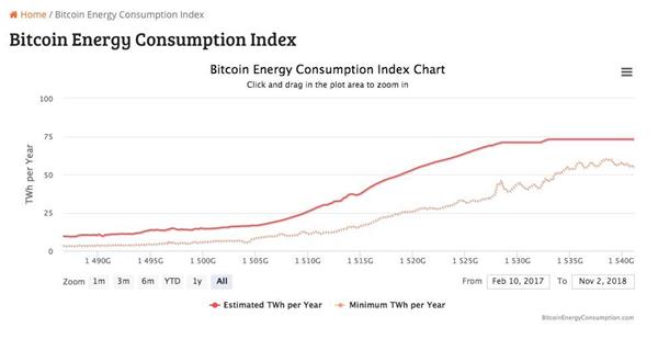 2018年11月4日Digiconomist提供的数据显示,全球比特币挖矿预计年能耗为73.12 TWh。