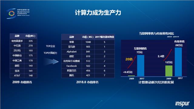 互联网经济的发展不仅体现在互联网产业,也体现在众多传统经济领域中,以传统零售业为例,从2009年到2017年传统零售产业增长了2.4倍,而互联网零售则增长了20倍,在整个零售产业中占比接近20%。产业互联网为传统产业带来了新的增长优势,计算力成为新兴产业发展及传统产业转型升级的"新动能"。