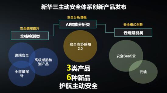 为了构筑和支撑完整的主动安全体系,新华三发布了全栈检测类、AI智能分析类、云端赋能类等三大类产品,其中包括6种新品——终端安全、高级威胁检测产品、全流量探针、安全态势感知2.0、安全云、云墙。