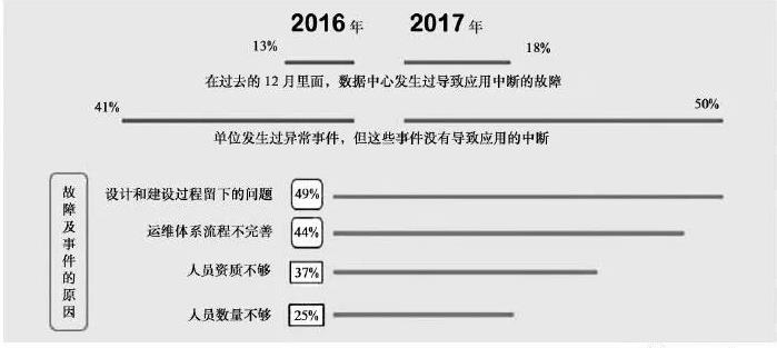 图2给出了某数据中心在2016~2017年发生故障的统计。从图中可以看出,在2016年,数据中心应用中断的故障占比为13%,而在2017年上升为18%。造成故障及事件的原因(有多种原因同时存在的情况),主要有设计和建设过程中的问题(占49%)、运维体系流程不完善(占44%)、人员资质不够(占37%)和人员数量不够(占25%),除设计和建造过程中的问题以外,其他三个方面均来自运维管理,可见运维管理对于数据中心的高可靠性和高可用性是十分重要的。