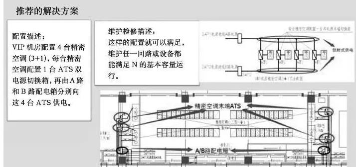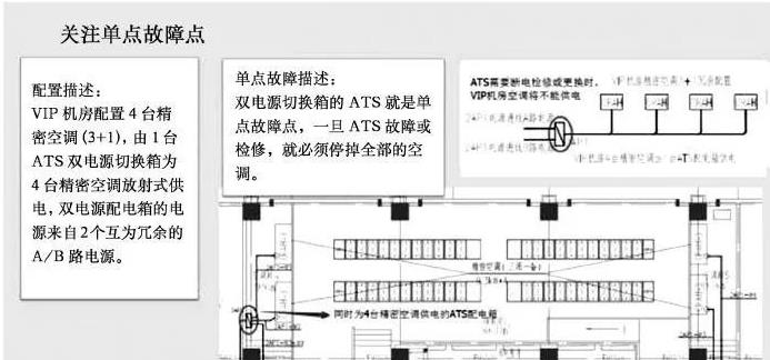在设计验证过程中,最为关注的是各系统中的单点故障点。图3给出了一个单点故障点的实例。图中表示,由一台ATS双电源切换箱为四台精密空调放射性供电,双电源配电箱的电源来自互为冗余的A/B路电源。此时,双电源切换箱的ATS就成为了单点故障点。一旦ATS故障或维修,全部空调将断电。