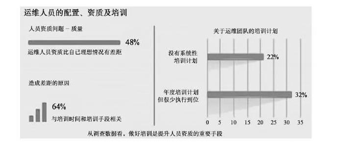 在运维体系建立过程中,其实有很大比例的、普遍的问题是人员,我们从调查的角度结果来看说,很多人觉得运维人员很重要,作为运维管理人有同样的感受。运维体系建立过程中的差距,其原因与培训的时间、培训的手段都有关系。没有系统的培训,或者培训计划没有办法执行到位,是一个关键的缺陷原因。为什么没有办法执行到位呢?主要的原因是运维人员不够用,所以就没有富余的时间参加培训,对于大部分数据中心来说,钱还不是问题。安排足够的培训时间和有针对性的培训计划,这是管理层要予以重视的问题。图14表明了运维人员的配置、资质和培训的重要性。