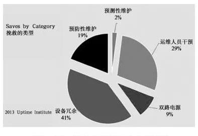 Uptime2013年给出了一个挽救的模型(SavesbyCategory),那哪什么叫挽救呢?有一个事件,没有演变成一个故障事故,从事件变成故障事故的期间,要采取措施使其不要变成故障事故,这段期间就是Saves。一个异常情况定义为一个异常事件,故障事故就是应用中断。根据Uptime的统计数据,若采用双路电源供电,可以挽救9%的事件;设备冗余可以挽救9%的事件;说明50%的事件通过基础架构来挽救,使其不变成故障事故。而另外50%的事件要通过运维人员干预(29%)、预防性维护(19%)和预测性维护(2%)来挽救,使其不变成故障事故。Uptime2013年给出的挽救的模型见图15。