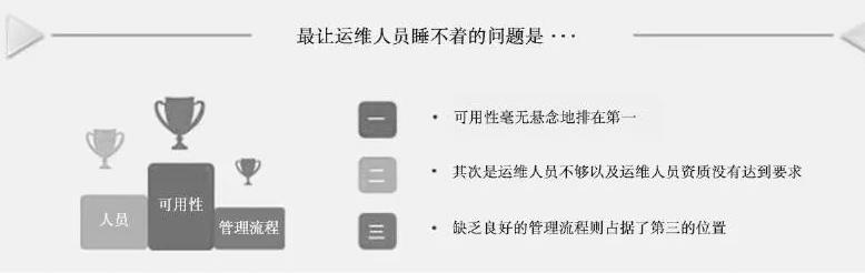 从图1中可知,可用性、高素质运维人员的匮乏和没有良好的管理流程占据令人头痛问题的前三位。