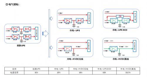 首先从供电架构上,百度云计算(阳泉)中心采用市电+UPS、市电+UPS(ECO)模式、市电+高压直流在线、市电+高压直流离线四种架构。其中市电+高压直流+离线的供电架构是世界首例,结合国内首批内置式锂电池机柜的部署,使供电效率从传统2N冗余UPS双路供电的90%大幅度提高到了99.5%,最大限度地利用了资源。
