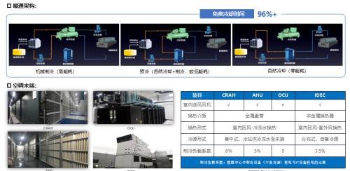 百度云计算(阳泉)中心的另一个节能方式在于暖通架构。百度云计算(阳泉)中心同时采用了CRAH(冷冻水槽精密空调)、AHU(组合式空调箱)、IDEC(间接风测)和OCU这四种新型的空调末端形式。百度自研置顶冷却单元OCU(Overhead Cooling Unit)新型空调末端,与预制模块技术结合,冷却模块垂直安装在机架上方,空调末端无风扇、零功耗,利用空气对流原理,可以抽走“热通道”的热空气的同时,还可以送出冷空气给“冷通道”。此外,传统服务器要求环境温度为5~35℃,服务器一般运行在25℃左右,百度特别研究的高温服务器,其耐温设计高达45℃,更少的冷源需求也大幅降低了数据中心能源消耗。