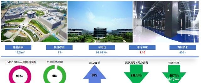 在暖通架构方面同时采用CRAH、AHU、IDEC和OCU四种新型的空调末端形式,其中百度自研置顶冷却单元OCU(Overhead Cooling Unit)新型空调末端,空调末端无风扇,零能耗,结合预制模块技术,将冷却模块垂直安装在机架上方,利用空气对流原理,将“热通道”的热空气抽走,同时送出冷空气给“冷通道”,这一技术的采用,大大降低了数据中心的能耗消耗。而且,百度云计算(阳泉)中心还是国内首个应用光伏发电的数据中心,同时大量签约风电清洁,2018年使用的风能和太阳能可以达到5500万度,预计占全年使用量23%以上。