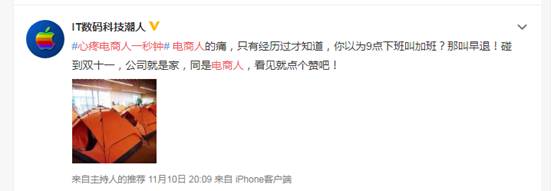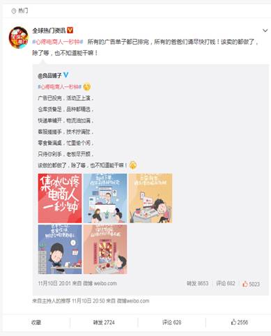 11月10日晚8时到11日零点,一个#心疼电商人一秒钟#的话题引爆微博及朋友圈,电商圈大V先后转发,紧接着吃瓜群众集体围观,自媒体组团自黑,一度将话题推上了微博话题榜第三名。截止11日0点,话题参与和阅读数超过200万;朋友圈也迅速被刷屏。