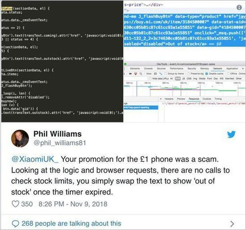 由于参与者众多而手机数量太少,这次闪购活动很快便结束了。在活动结束后,很多消费者在推特上表达了他们的不满,认为小米举办的这次闪购活动缺乏诚意;甚至有一位消费者挖掘出了本次活动网站的代码,发现只要消费者在网站下单就会收到“缺货”提示,直接跳过检查库存、核对订单等本该有的过程。