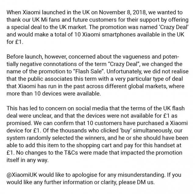 对此,小米很快通过其英国推特账号发布了一则道歉声明,并解释称,负责该活动的团队“没有意识到公众将这次特殊的活动与小米在其他国家推出的活动联系在了一起,因为小米在其他一些国家的推出的活动是超过10部手机的。”