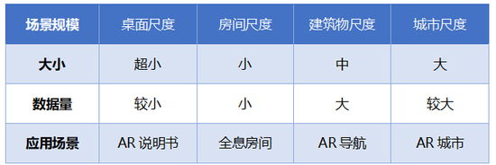 l 桌面尺度:通常指不大于一个桌面的大小,说是"桌面"只是便于直观的理解,并非只是局限在桌面上。在这个尺度下,数据量较小,一般本地即可存储。在这个场景规模下会出现“AR说明书”等应用场景,比如视+AR做的汽车AR说明书,用户通过手机或者智能眼镜扫描汽车就能获得汽车各个部位的详细说明介绍和使用指南,省去了翻阅纸质说明书的麻烦。
