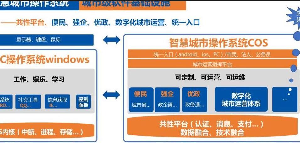 可以看到,操作系统(OS)有一个内核,包括中断管理、进程管理、寄存器管理等等功能,姑且不论其具体作用,我们只要知晓正是在这些内核的支撑下,我们才能用电脑“冲浪”。类比到智慧城市,也可以有一个内核-共性平台,提供服务认证、消息通知、在线支付等共性技术支撑,然后基于这种数据及技术的融合来屏蔽底层复杂技术的同时,面向各类上层智慧应用开放,最终通过统一的城市服务入口推送给市民。