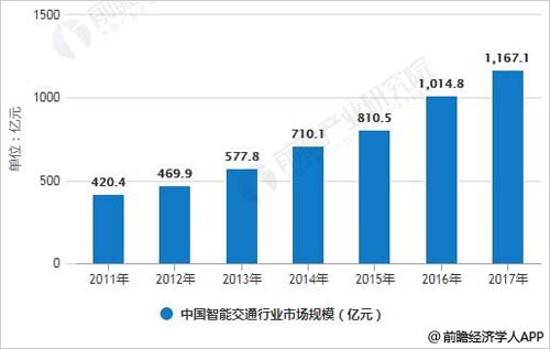 据前瞻产业研究院发布的《智能交通行业市场前瞻与投资战略规划分析报告》统计数据显示,2011年中国智能交通行业市场规模已到达420.4亿元。之后一直保持高速增长态势。2014年中国智能交通行业市场规模突破700亿元,2015年突破了800亿元。到了2016年中国智能交通行业市场规模超1000亿元。截止到2017年中国智能交通行业市场规模达到了约1167.1亿元,同比2016年的1014.8亿元增长了15.01%。