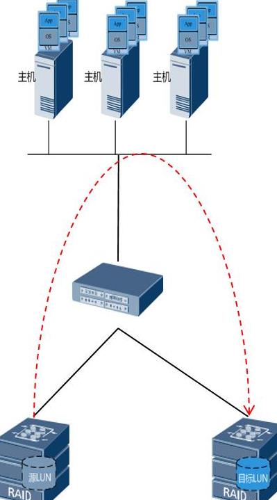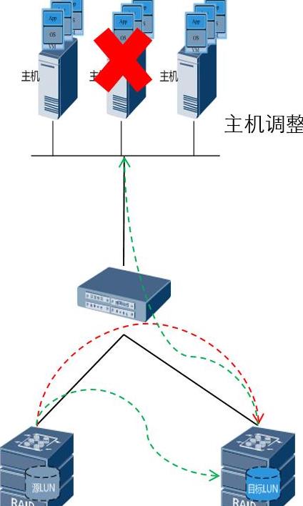 将目标存储加入客户的应用系统中,新增链路为“服务器主机—目标存储”。在目标存储阵列上将新建的LUN分配给服务器主机。此操作不需要(部分平台需要)中断客户业务系统;