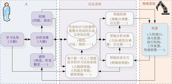 随着深度学习算法与大数据的兴起,人工智能在经历六十多年的曲折发展过程后迎来蓬勃发展期。新一代人工智能技术使“人-信息-物理系统”发生质的变化,信息系统中增加了基于人工智能技术的学习认知部分,使系统不仅具有强大的感知、计算分析与控制能力,还具有自学习、自适应的能力,进而形成新一代“人-信息-物理系统”。中国工程院院士周济等人认为,新一代人工智能技术对“人-信息-物理系统”产生的主要变化在于:一方面,人将部分认知与学习型的脑力劳动转移给信息系统,因而信息系统具有了“认知和学习”的能力,人和信息系统的关系发生了根本性的变化,即从“授之以鱼”发展到“授之以渔”;另一方面,通过“人在回路”的混合增强智能,人机深度融合将从本质上提高制造系统处理复杂性、不确定性问题的能力,极大地优化制造系统的性能。