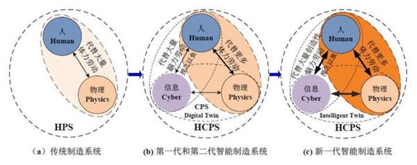 与传统制造系统相比,第一代(数字化)和第二代(数字化网络化)智能制造系统发生的本质变化是在人和物理系统之间增加了信息系统(cyber system)。一方面,信息系统可以代替人类完成部分脑力劳动;另一方面,人的一部分感知、分析、决策功能向信息系统复制迁移,进而可以通过信息系统来控制物理系统,从而代替人类完成更多的体力劳动。信息系统的引入使得制造系统同时增加了“人-信息系统”(human-cyber systems,HCS)和“信息-物理系统”(cyber-physical systems,CPS),并使得制造系统完成了从传统的“人-物理系统”向“人-信息-物理系统”(human-cyber-physical systems,HCPS)的演变。