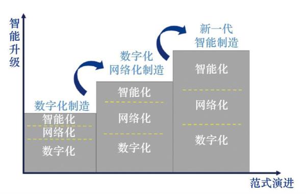 中国工程院于2017年发布《中国智能制造发展战略研究》报告,综合智能制造相关范式,总结、归纳和提升出三种智能化制造的基本范式,即:数字化制造、数字化网络化制造、数字化网络化智能化制造。