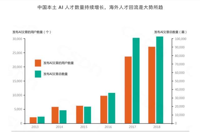 技术的迅速发展,更直观的体现是AI人才的急速增长。据统计,2013年到2016年,无论是发布AI文章的总用户数,还是AI文章的总数量平均都有至少2倍速的数量增长,而这两大维度的数据集中爆发的时间点是2017年,到2018年,AI文章的数量进入缓慢增长期。