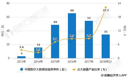 2013-2018年Q1中国医疗大数据投融资事件及占大健康产业比率统计情况