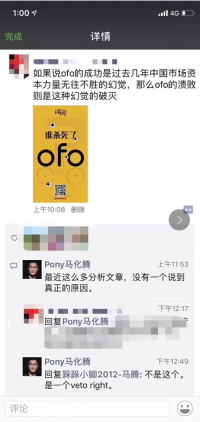 ofo小黄车用户申请退押金用户已达到1200万人之多,关于ofo失败的原因,马化腾在朋友圈评论道:是一个veto right。