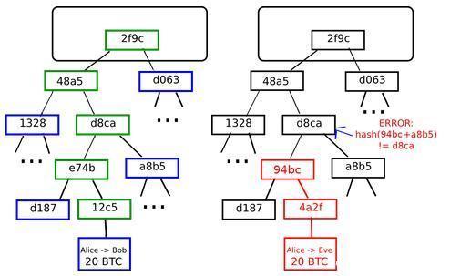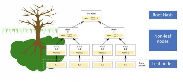 单独的数据块被称为“叶节点”,它们被哈希后,形成“非叶节点”。这些非叶节点然后能够组合在一起进行哈希,直到所有的数据块可以用单独一个根哈希值表示。这是更简单的概念化方法: