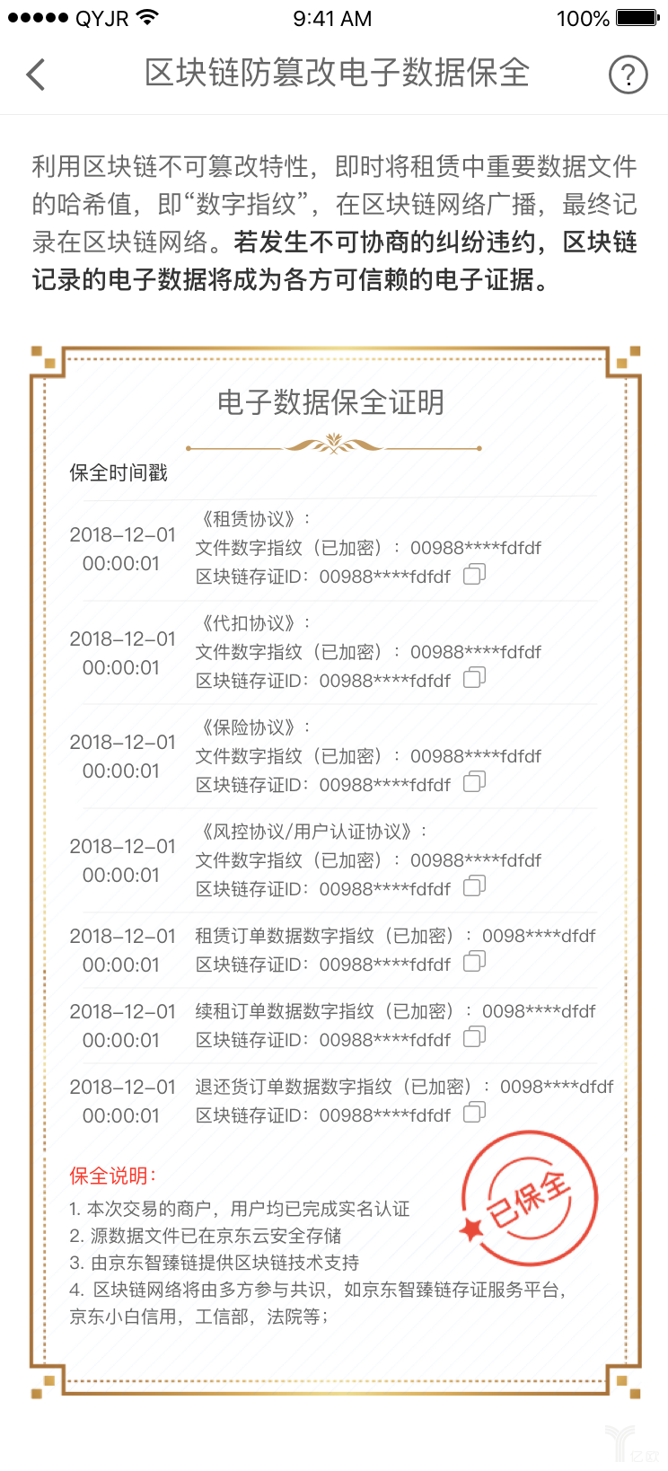 如上图所示,首先该用户完成了租赁下单,用户可以能看到“区块链防篡改电子数据保全已完成”的提示。用户还可进一步点击进入查看区块链保全详情。