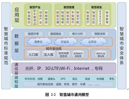 智慧城市通用模型自下而上分为:感知层、通信层、数据层、应用层;以及完善的标准体系和安全体系。智慧城市通用模型如下图所示: