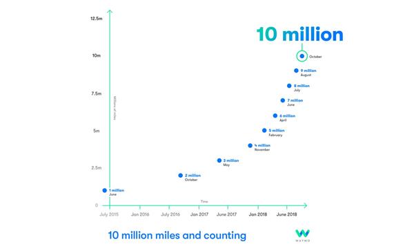 2018 年 10 月,Waymo 宣布该公司的自动驾驶车辆实现了 1000 万英里路测的目标,这一数字在去年 11 月的时候,还只有 400 万英里,下图展示了 Waymo 路测数据快速增长的势头。