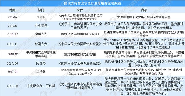 2018年,中国已经步入大数据时代,政府、企业和个人对信息安全日益关注,近几年,国家相继出台系列政策支持信息安全行业的发展。信息安全已上升为国家战略。