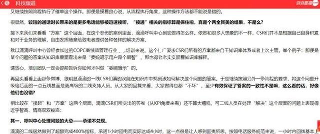 凤凰网和虎嗅网新闻中提到:就以滴滴呼叫中心曾经参加过的COPC培训来说,COPC要求CSR们所有的方案都来自于知识库体系或者上级主管。举个例子:即便是某个问题的答案从知识库里面查出来是“委婉暗示用户是个弱智”,那也得老老实实照着知识库解释。(此处笔者备注:这是典型的引导企业只雇佣员工的嘴而不用员工的脑子!)