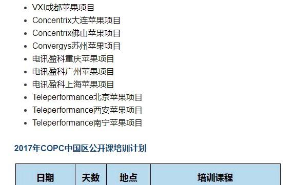 COPC无视和违反苹果诉求,为了市场拓展需求,把苹果客服是外包的信息及外包给哪些外包商,在哪些城市的信息完全曝光了。。对于一般企业可能问题不大,但对于苹果用户账户信息ID号等的防护,在某些情况下,这变成了致命的了。当初应用COPC时,估计苹果管理者都没有想到过这样的结果。。