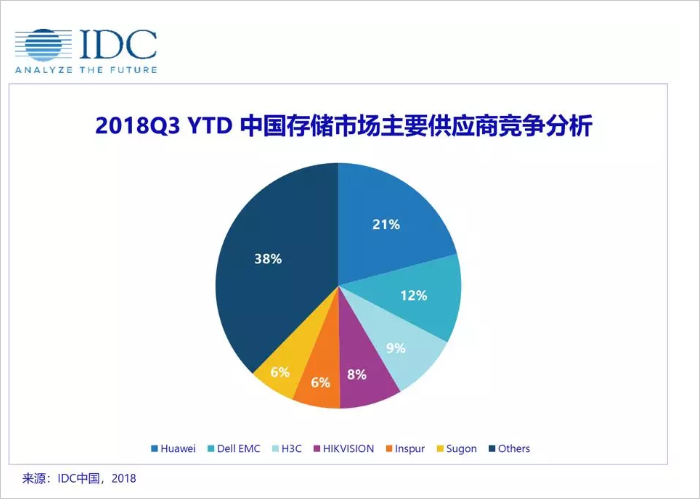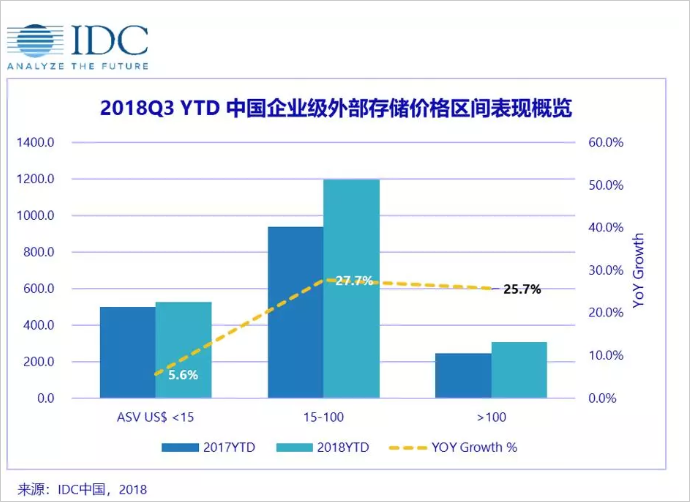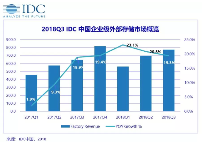 回到中国存储市场。2018年第三季度,中国存储市场占全球存储整体市场12.2%的份额,以19.3%的季度增长率仅次于美国市场,位列全球第二,市场规模达到7.7亿美元。