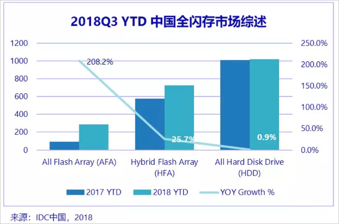 2018年三个季度以来,全闪存的市场占有量逐步增加到14.0%,较去年同期实现了208.2%的大幅度增长。与全球相比,中国全闪存仍有超过15%的市场占有量等待追平,这也从一个侧面显示了国内闪存市场的巨大潜力。