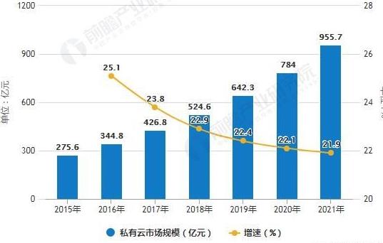 据前瞻产业研究院发布的《中国云计算产业发展前景与投资战略规划分析报告》统计数据显示,我国公有云市场保持50%以上的增速。截止至2017年我国云计算整体市场规模达691.6亿元,增速34.32%。其中,公有云市场规模达到264.8亿元,相比2016年增长55.7%,预计2018-2021年仍将保持快速增长态势,到2021年市场规模将达到902.6亿元,私有云市场规模达426.8亿元,较2016年增长23.8%,预计未来几年将保持稳定增长,到2021年市场规模将达到955.7亿元。