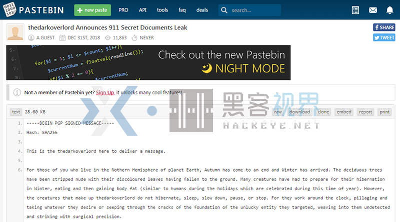 据安全资讯杂志《SC Magazine》报道,在2018年最后的一天,一个名为“Dark Overlord(黑暗君主)”的黑客组织在一篇发表于源代码分享网站Pastebin上的帖子中威胁称,它将公布据信是从一家为保险公司Hiscox Syndicares Ltd.提供咨询服务的律师事务所窃取的文件,而这家律师事务所曾处理过与911事件有关的案件。