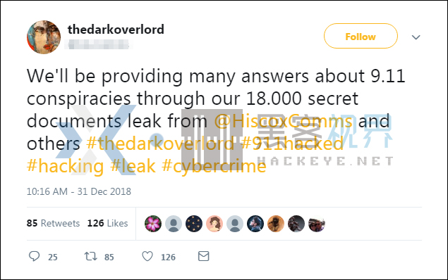在美国世贸中心(World Trade Center)的名单中,Hiscox Syndicares Ltd.被描述为“全球最大的保险公司之一”。Dark Overlord在随后发布的一条推文中也表示,“我们将通过一些网站泄露的18000份秘密文件,为9.11阴谋提供许多答案”。