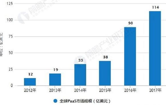 当前全球云计算三种交付模式中,PaaS份额最小,但增速最快。据前瞻产业研究院发布的《中国云计算产业发展前景与投资战略规划分析报告》统计数据显示,2012年全球PaaS市场规模为12亿美元。2014年全球PaaS市场规模超30亿美元。到了2016年全球PaaS市场规模快速增长至90亿美元。截止到2017年全球PaaS市场规模已经突破100亿美元,达到了114亿美元,同比增长26.7%。