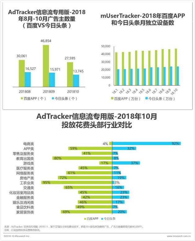 从独立设备数以及广告主数量来看,百度在2018年都保持了对今日头条的优势。