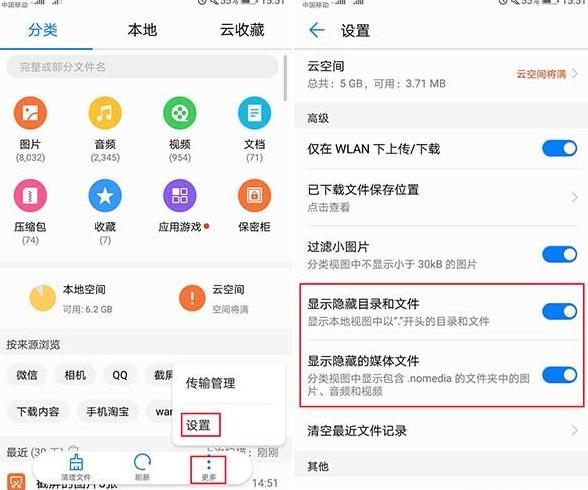 点击华为手机的【文件管理】-【更多】-【设置】,然后将【显示隐藏目录和文件】和【显示隐藏的媒体文件】打开。