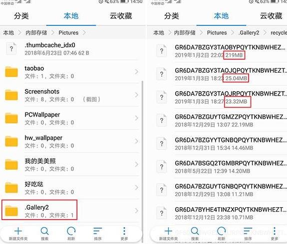 回到【文件管理】,选择【本地】-【内部存储】-【Pictures】-【.Gallery2】,可以发现里面有675个文件,文件大小从200MB到10MB左右不等。可想而知这六百多个文件占用了多少手机存储内存!难怪手机存储内存会不足!