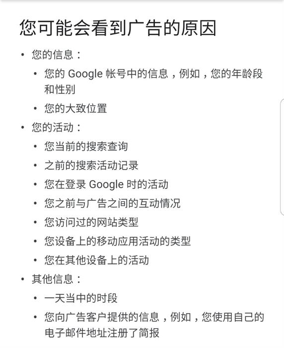 同样,广告和隐私之间也总是存在关系,谷歌也面临着如何妥善处理用户隐私的问题,当谷歌向你推送相关广告的时候,它总是会根据你之前相关信息和行为来进行匹配,甚至谷歌在其广告解释条文中明确地告知广告是根据哪些信息进行推送的,随着政府和公众对隐私问题重视程度越来越高,谷歌也面临着如何在精准广告和保证隐私这二者之间取得平衡。