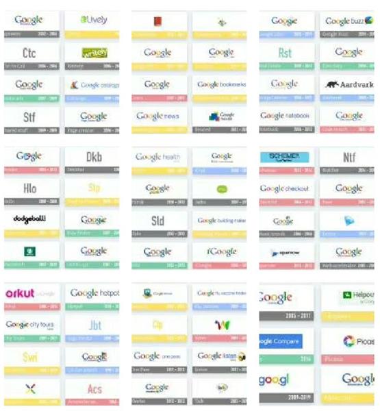 可能你会问为什么谷歌能做出这么多成功的产品而其他企业不能呢?或许你应该换一个问题——为什么谷歌做了那么多产品只成功了这么少?下图是谷歌失败产品的不完全统计。
