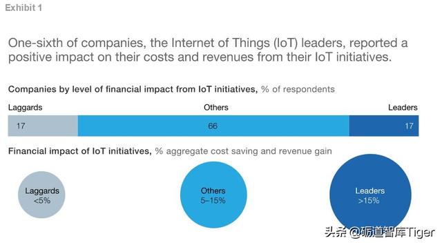 然而,即使在拥有大规模物联网努力的公司中,最重要的表现者与最低层之间存在巨大差距。在一项针对拥有成熟物联网计划的300家企业(超出试点项目的企业)的物联网从业人员调查中,约有六分之一的人表示他们的公司已经从物联网中获得了巨大的回报,总体成本和收入影响至少达到15%。1 我们称这些公司为物联网领导者。另一方面,大约六分之一的受访者表示他们的物联网工作总收入和成本改善不到5%(图1)。
