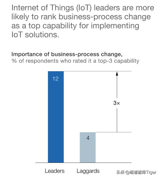 可以理解的是,许多执行团队认为物联网主要是一项技术挑战,并让他们的首席信息官(CIO)掌握其物联网工作。然而,将物联网作为一种纯技术发挥作用,存在这样的风险:公司将通过重新设计流程来利用物联网的能力,忽略它们可能捕获的所有价值。例如,使用远程传感器来收集来自燃气轮机的性能读数可以为公用事业提供足够的数据以对涡轮机执行预测性维护,这比根据预设的时间表进行预防性维护更有效。但是,如果公用事业工作人员不将他们的工作惯例与新的预测维护方法保持一致,那么潜在的效率就无法完全实现。难怪,物联网领导者的调查受访者认为管理业务流程变更是实施物联网解决方案的三个最重要的能力之一(图3),这比物联网落后者的可能性高三倍。