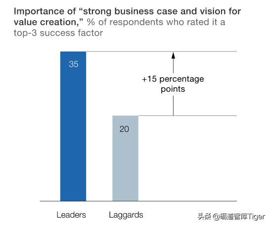 物联网领导者比落后者高出75%的可能性,他们将强有力的商业案例或明确的价值创造愿景作为其物联网计划的关键成功因素(图表5)。如果没有这样的愿景,公司就会发现很难将其物联网计划与其业务战略联系起来,或者优先考虑一套连贯且完善的用例。我们看到的最佳物联网愿景包括价值主张(为客户解决问题的产品比现有产品更好),交付模式(物联网产品和服务的市场路线,由业务及其价值链合作伙伴支持))和经济模型(企业获取其物联网产品和服务创造的一些价值,同时与客户分享价值的一种方式)。